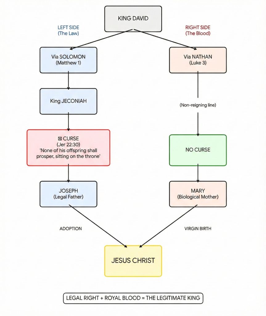 - Being legally adopted by Joseph, he inherits the “rights” to the throne (Solomon’s line), but not being Joseph’s biological son, he does not inherit Jeconiah’s curse.